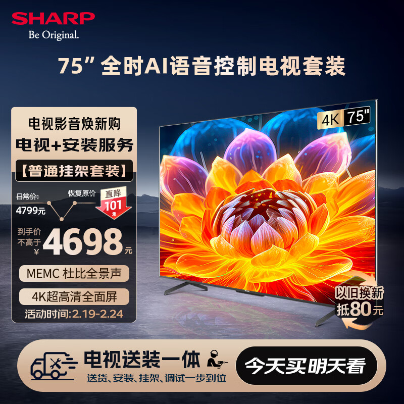 SHARP夏普电视75英寸 HDMI2.1 MEMC 杜比全景声C75FL1A 4K超高清【包安装 固定挂架送装一体】价格:4698.00元!