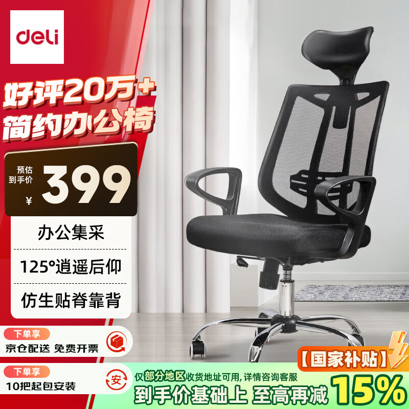 得力(deli)4905 人体工学电脑椅 头枕可调办公椅 仿生靠背125°后仰价格:349.00元!