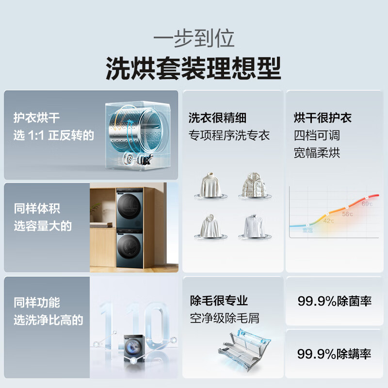 1、外形外观:鸢尾蓝颜色显得很高级,大小合适,总体轻薄,不占空间洗净效果:洗净比高,效率也高!容量大小:容量目前相当足够,因为洗衣机和烘干机都是10kg,平常衣服和床套都可以轻松搞定以旧换新:以旧换新活动真的很不错,旧机器也处理掉了,活动补贴也非常给力,回收和送新都是****,省心!