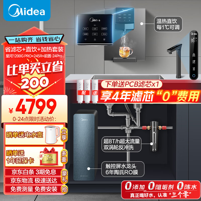 美的(Midea)省芯直饮加热净水器套装【星河1200pro+管线机MG245-R+前置-24pro】 家用壁挂式加热一体净饮机价格:4799.00元!