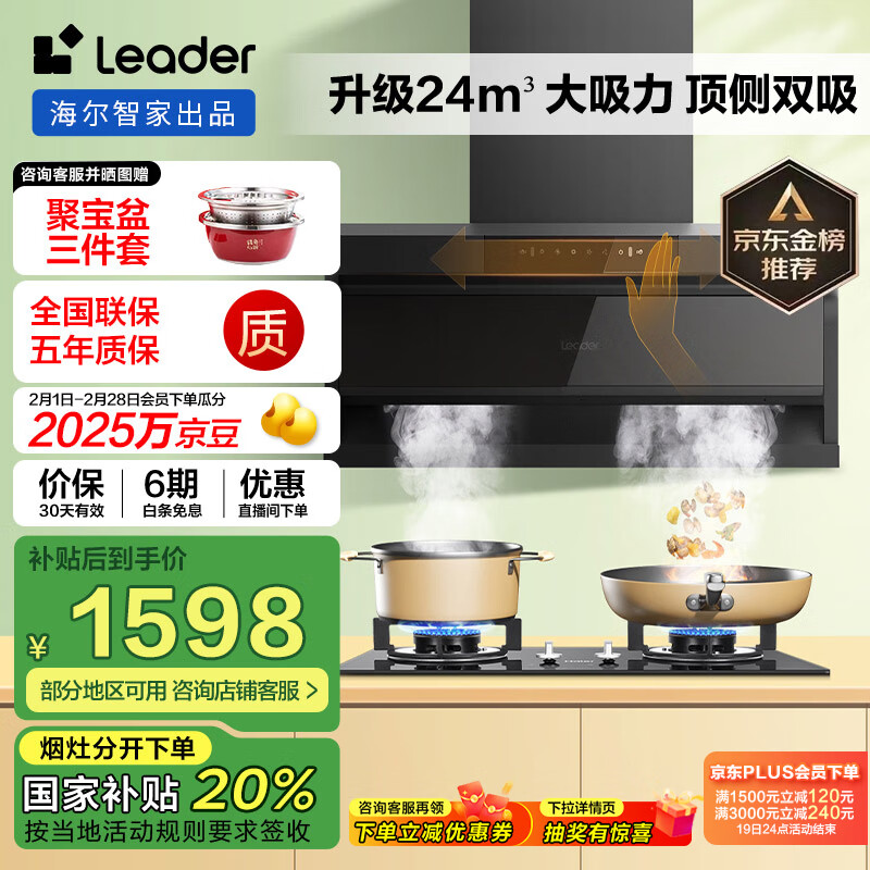 海尔(Haier)智家出品 统帅Ieader 顶侧双吸抽油烟机灶具套装 24大吸力 挥手 自清洁以旧换新IQ92D+BE2(天)价格:1998.00元!