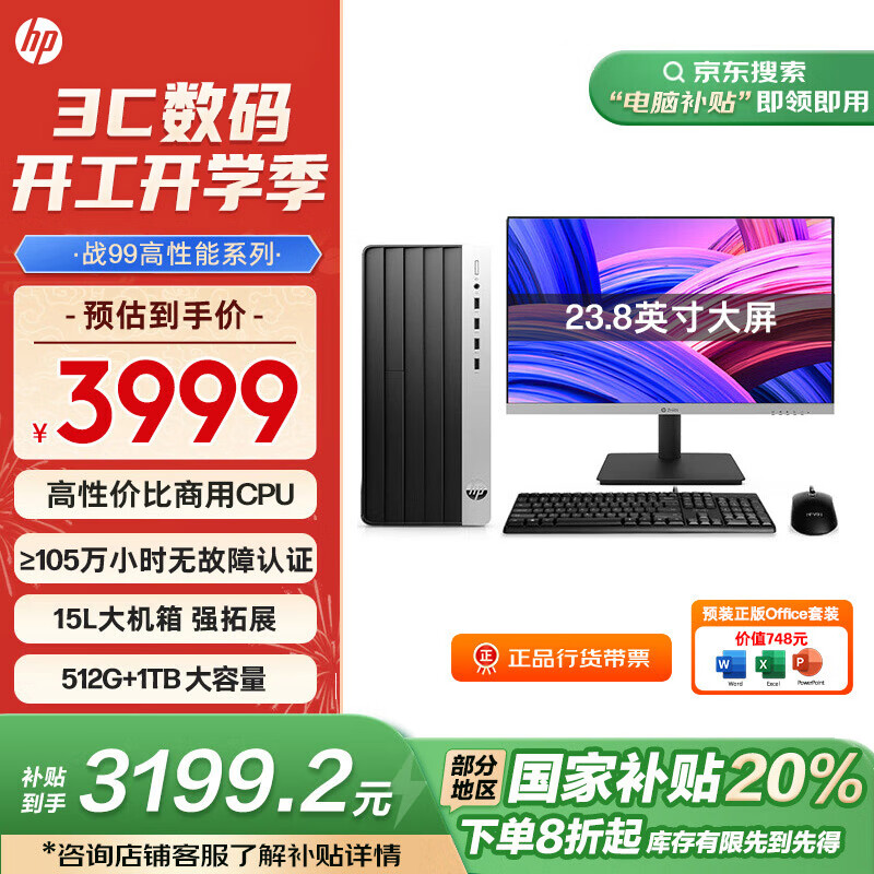 惠普 补贴 战99 高性能台式电脑 (13代i5-13500 16G 512G+1T) 23.8护眼大屏 办公学习生产力价格:3999.00元!