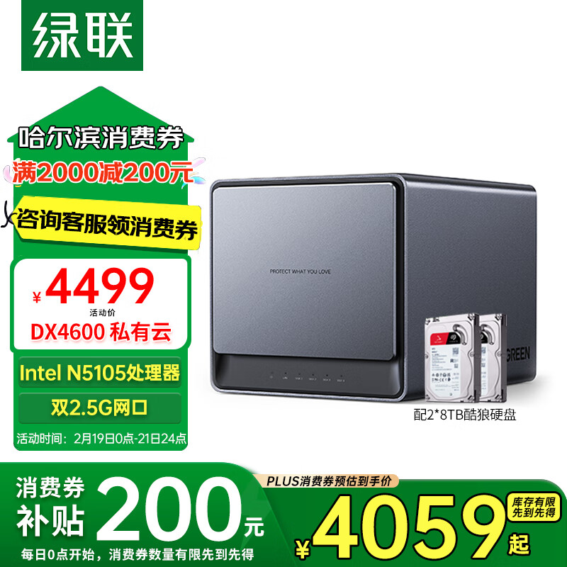 绿联 私有云DX4600 16T四盘位Nas网络存储个人云硬盘服务器相册备份文件同步手机平板扩容适用iPhone16价格:4499.00元!