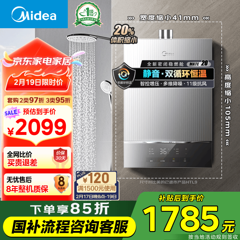 美的(Midea)16升燃气热水器天然气【国补立减15%】静音一级节能 双循环恒温 下置风机 密闭稳燃JSQ30-MATE 20价格:2099.00元!
