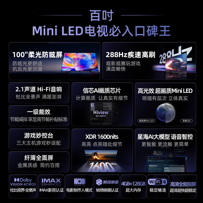海信电视 100E5N 100英寸MiniLED DeepSeek AI电视 288Hz高刷 大屏超薄游戏液晶 以旧换新家电补贴价格:10499.00元!