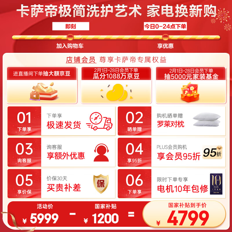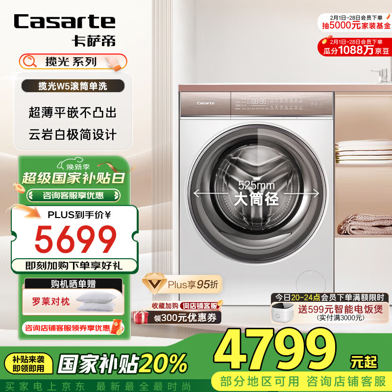 卡萨帝(Casarte)揽光W5滚筒洗衣机全自动家用 10公斤直驱变频 智能投放 紫外线除菌 D10W5ELU1 补贴20%价格:5999.00元!