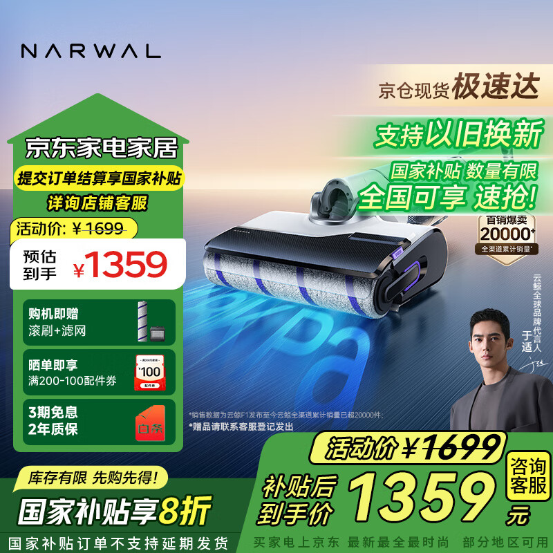 云鲸智能洗地机F1 版 全能洗地王吸拖一体180°躺平0缠绕家用无线手持吸尘器三贴边价格:1699.00元!