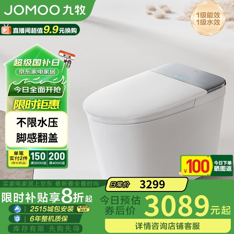 九牧(JOMOO)无水压限制智能马桶一体机节水脚感翻盖智能坐便器ZS700I 305坑距价格:3299.00元!
