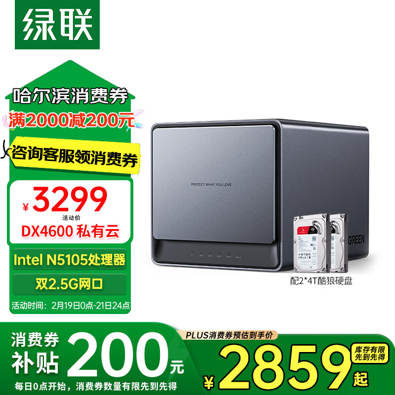 绿联 私有云DX4600 8T四盘位Nas网络存储个人云硬盘服务器相册备份文件同步 手机平板扩容适用iPhone16价格:3299.00元!