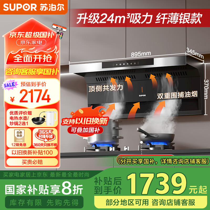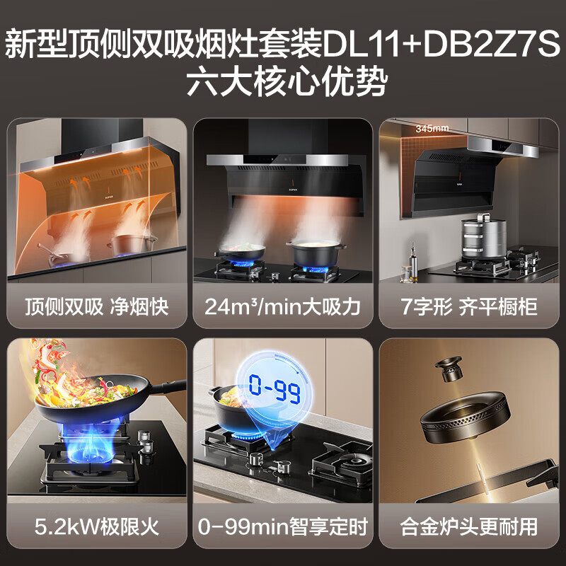 苏泊尔(SUPOR)抽油烟机家用 24立方大风量430Pa风压 顶侧双吸7字型挥手智控自清洁 燃气灶套装DL11+DB2Z7S液化气价格:2174.00元!