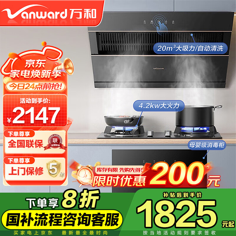 万和(Vanward)烟灶消三件套 侧吸式触屏易清洁 油烟机燃气灶具消毒柜厨房多件套 J525S+B3L20+D5(天然气)价格:2147.00元!