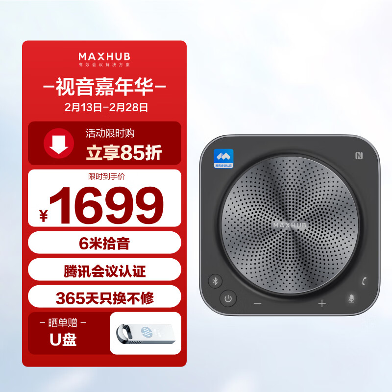 MAXHUB视频会议全向麦克风/6米拾音免驱无线连接蓝牙扬声器/腾讯会议认证/40㎡内会议室解决方案 BM31S价格:1699.00元!