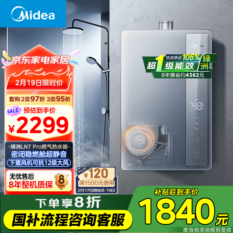 美的(Midea)16升燃气热水器天然气 国补立减20%【绿洲LN7】一级能效下置风机超静音恒温JSLQ27-16LN7 Pro价格:2299.00元!