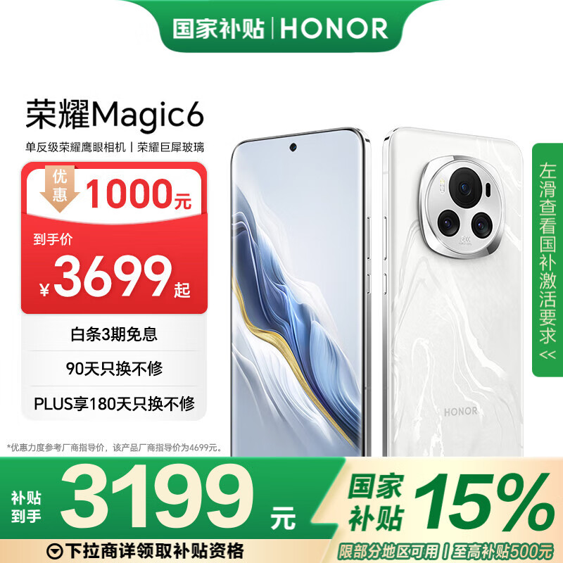 荣耀Magic6 单反级荣耀鹰眼相机 荣耀巨犀玻璃 第三代骁龙8 16+512 祁连雪 长续航 AI手机 政府补贴价格:3699.00元!
