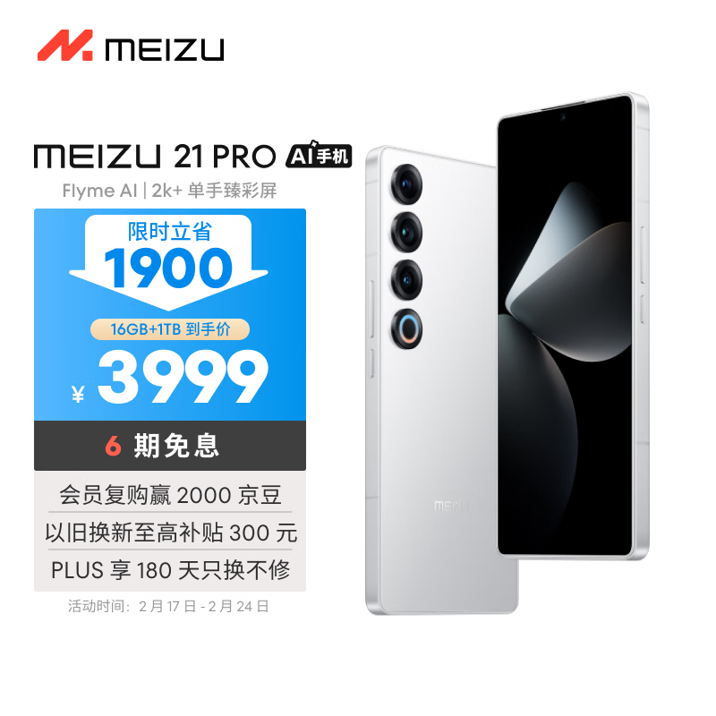 魅族(MEIZU)21 PRO AI旗舰手机 2k+臻彩屏 广域超声波指纹 5000万超稳AI影像 第三代骁龙8 16+1TB 魅族白价格:3999.00元!