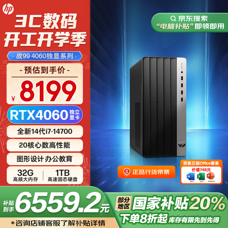 惠普 补贴 战99 游戏台式电脑(i7-14700 32G 1T RTX4060光追)畅玩黑神话 AI训练 DeepSeek部署价格:8199.00元!