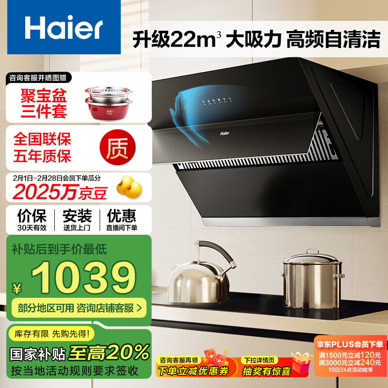 海尔(Haier)抽油烟机 侧吸式吸排油烟机 22m3/min大吸力 挥手智控自清洁 自动开合油烟机MA2C1 换新政府补贴价格:1299.00元!