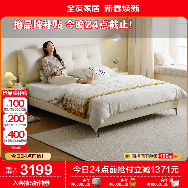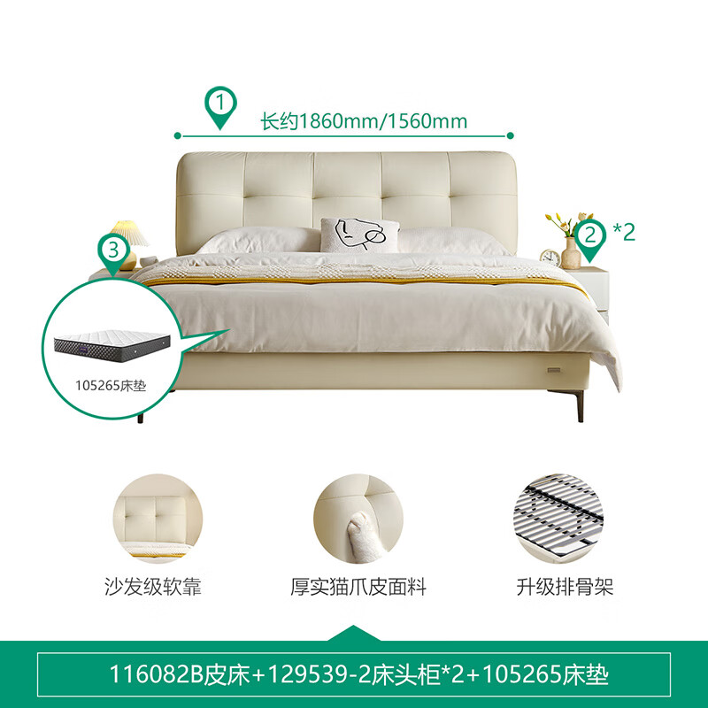 全友家居 主卧室皮艺床奶油风软包床头双人大床1.8米x2米成人床116082价格:4570.00元!