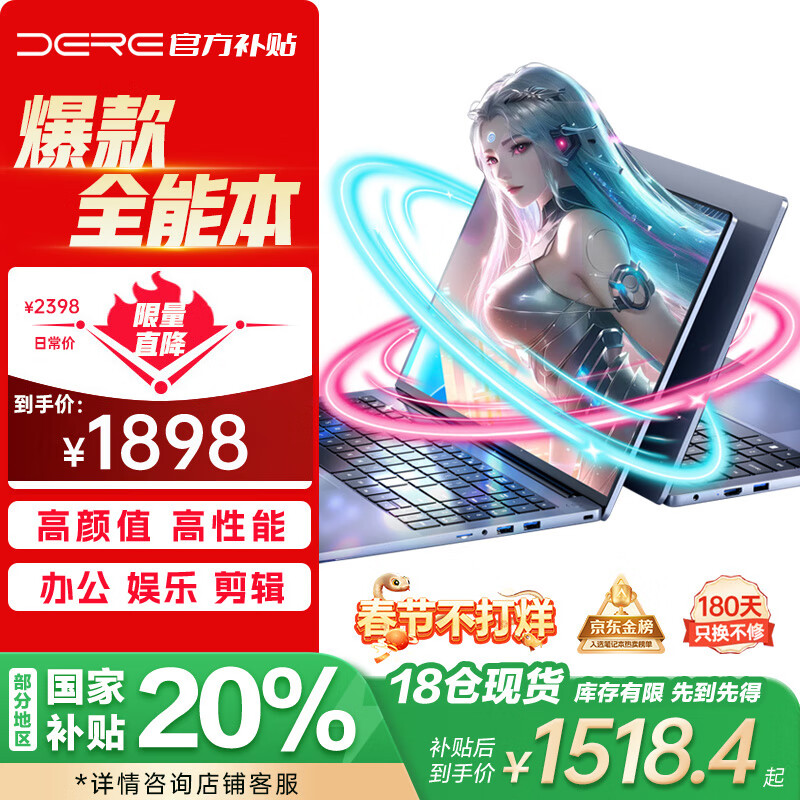 戴睿(dere)补贴商务旗舰高性能笔记本电脑自营 办公设计绘图学生网课娱乐游戏手提轻薄本 英特尔16G+512G价格:1898.00元!