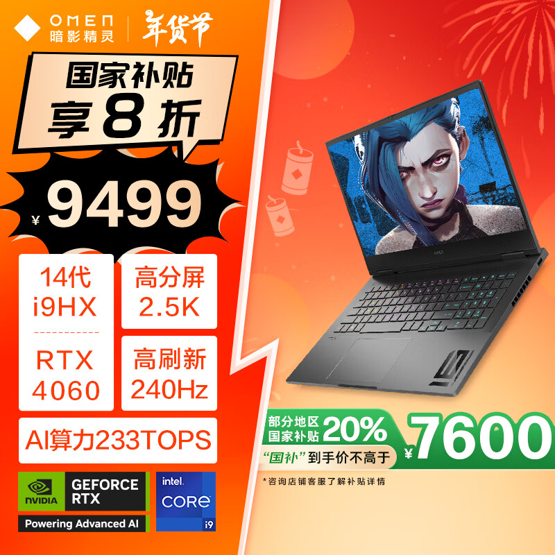 惠普(HP)暗影精灵10【补贴20%】16.1英寸游戏本笔记本电脑(酷睿14代i9-14900HX RTX4060 32G 1TBSSD)价格:9499.00元!