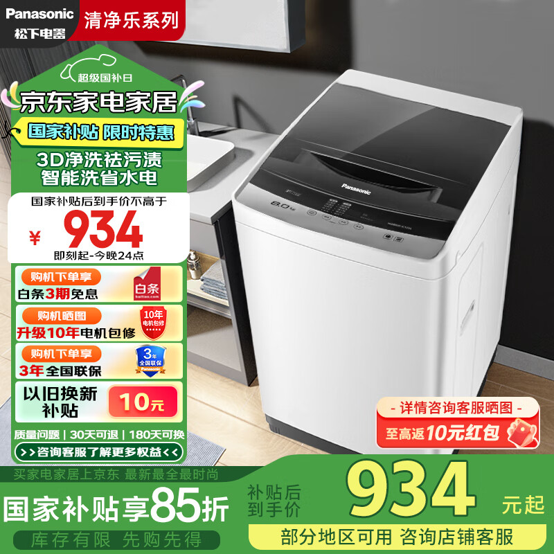 松下(Panasonic)波轮洗衣机全自动8公斤 宿舍租房神器 智能洗节能省水电桶自洁 XQB80-KYA0N 以旧换新补贴价格:1099.00元!
