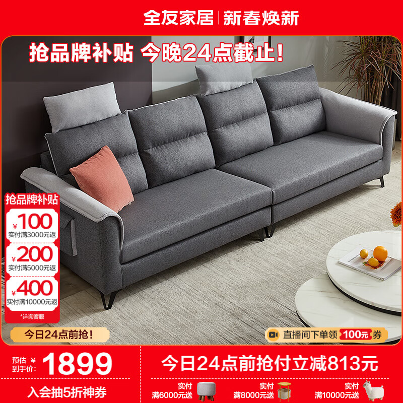 全友家居北欧一字沙发简约四人位沙发客厅小户型布艺直排式沙发102567价格:2712.86元!