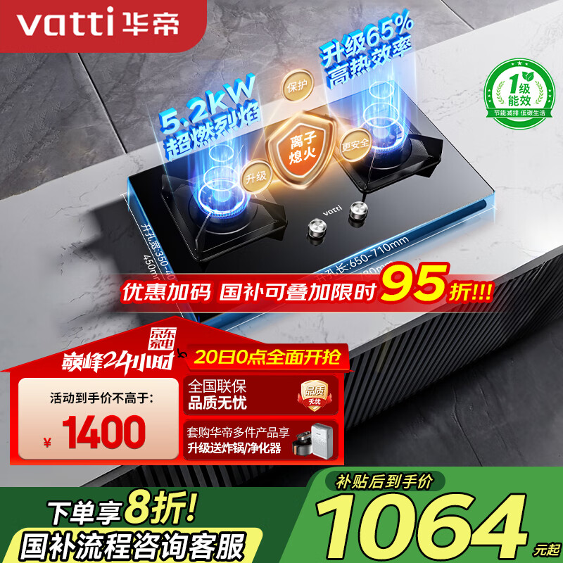 华帝(VATTI)政府补贴官方家用燃气灶天然气嵌入式双灶5.2kW猛火灶一级能效以旧换新煤气双灶台灶具i10076B价格:1400.00元!