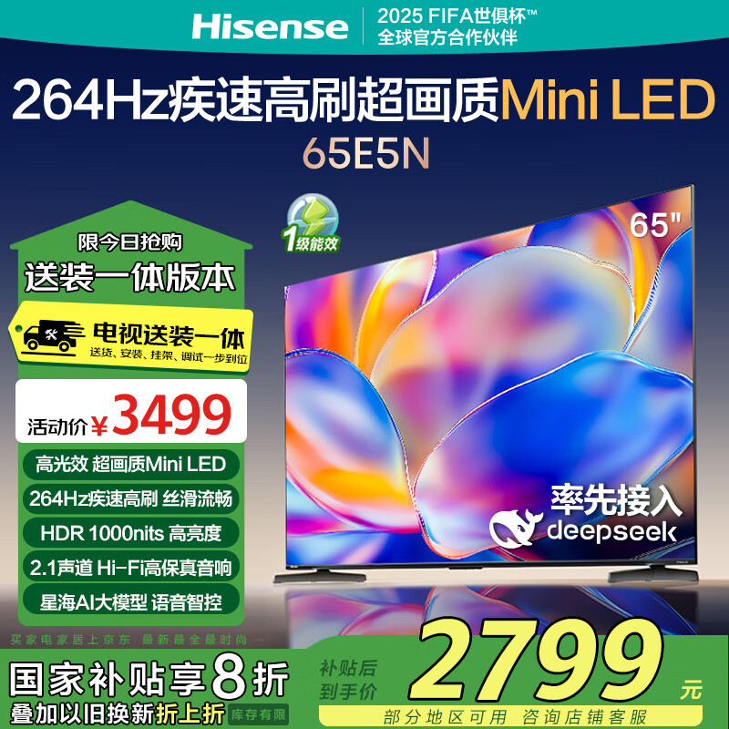 海信电视65E5N【包安装版-固定挂架送装一体】65英寸 MiniLED DeepSeek AI电视 以旧换新家电补贴价格:3499.00元!