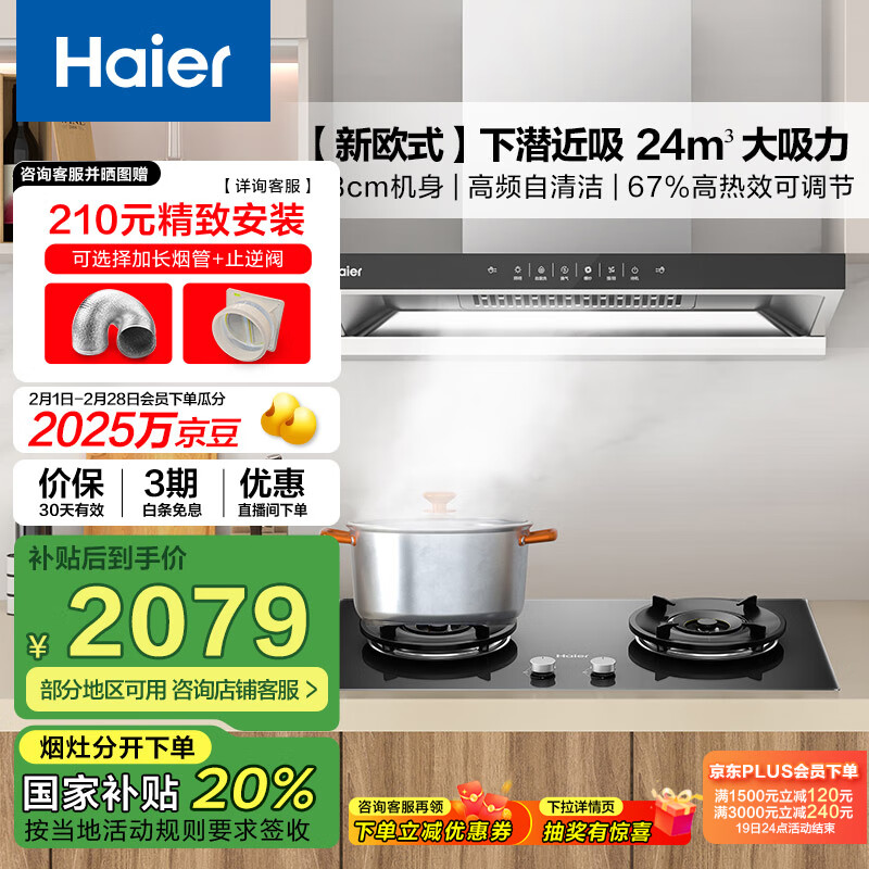 海尔(Haier)油烟机 抽油烟机燃气灶套装 新欧式深潜近吸24立方挥手感应 67%高热效烟灶套装ET906S+Q2BEA天价格:2599.00元!
