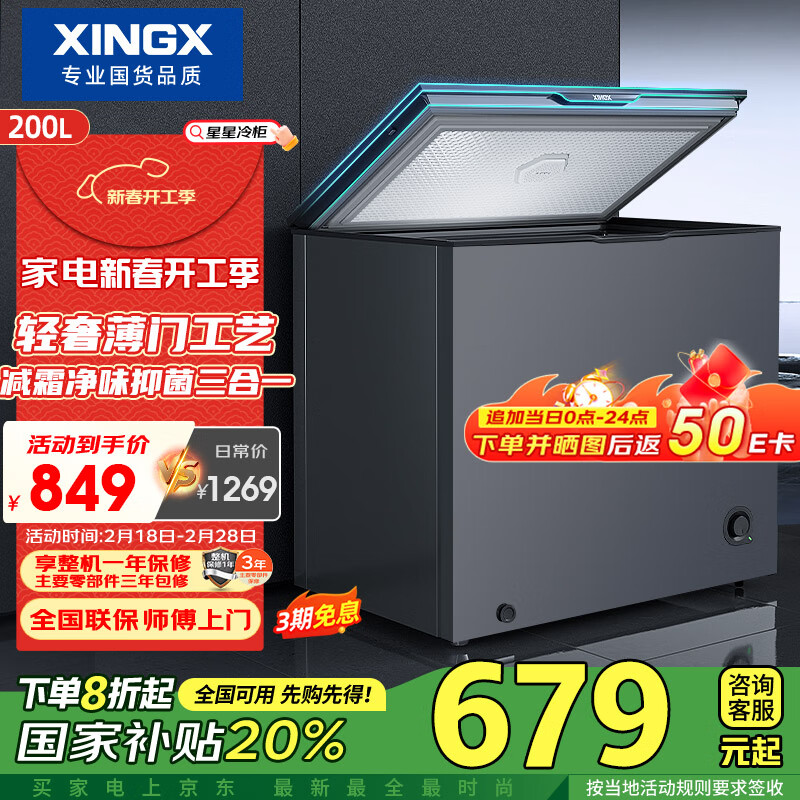 星星(XINGX)200升家用减霜净味薄门冰柜 冷藏冷冻转换冷柜 节能顶开冰箱 BD/BC-200KE补贴价格:849.00元!