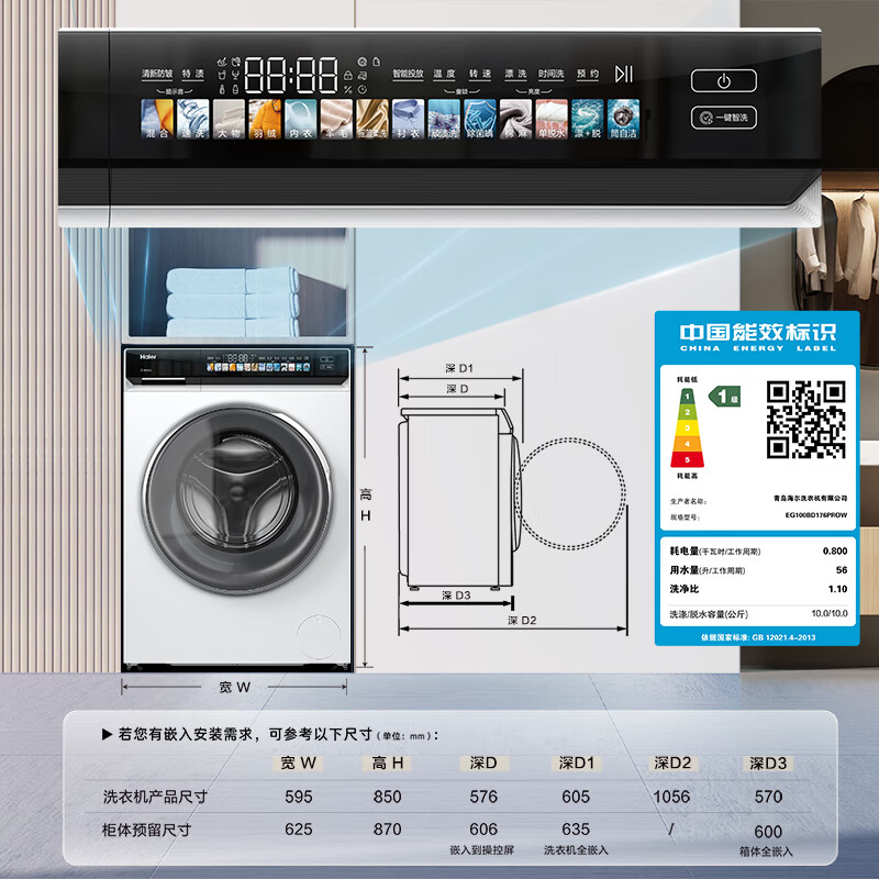 2、这款海尔滚筒洗衣机是全自动8公斤的EG80MATESL6,真是很不错,445mm超薄平嵌,大容量,大筒径,高颜晶彩屏,BLDC变频电机,操作方便,美观实用。安装后加电试用了一下,挺不错,推荐给大家。