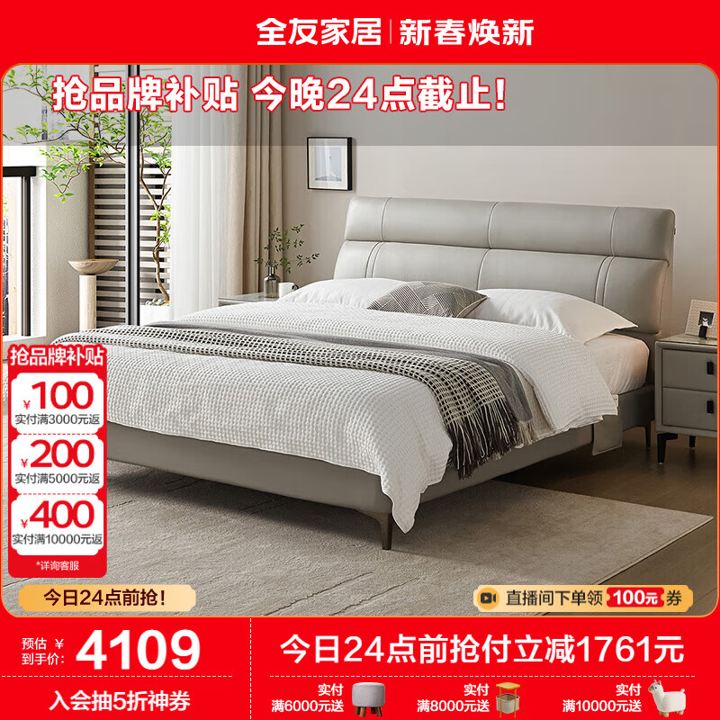 全友家居 现代简约风真皮床主卧室1.8x2米头层牛皮艺床双人大床105251价格:5870.00元!