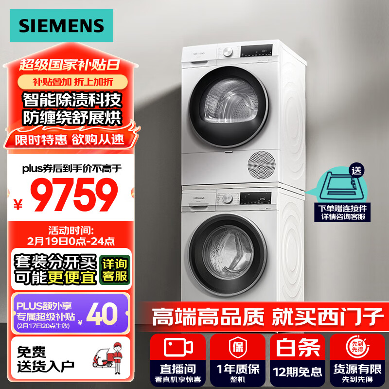 西门子(SIEMENS)iQ300 10+10kg洗烘套装 智能除渍除螨 热泵速烘 WG52A100AW+WQ55A2D00W 补贴以旧换新价格:10099.00元!