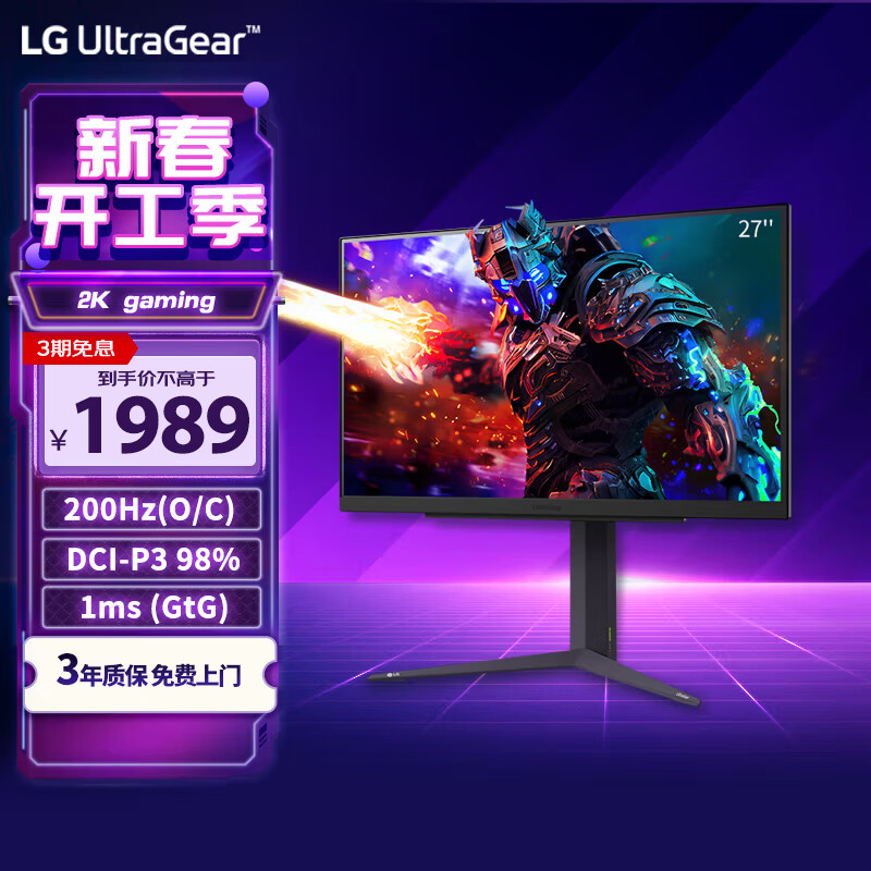 LG 27英寸 GP850升级款 NanoIPS 2K 200Hz超频 HDR400 1ms G-Sync 满血版 游戏电竞显示器 27GS85Q价格:1989.00元!