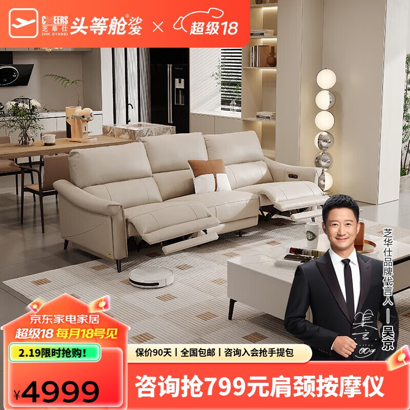 芝华仕(CHEERS)头等舱智能椅绅士皮沙发零靠墙现代简约电动功能芝华士50611B白三价格:4999.00元!