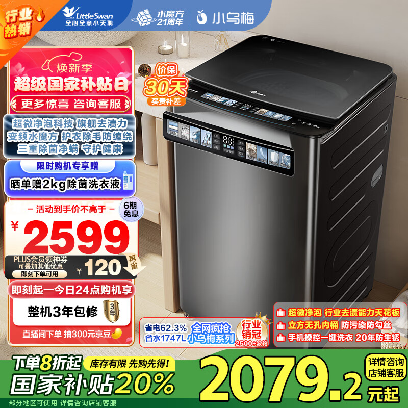 小天鹅(LittleSwan)波轮洗衣机全自动 小乌梅 【TB100V85PLUS】水魔方防缠绕超微泡 10公斤 家电补贴20% 以旧换新价格:2599.00元!