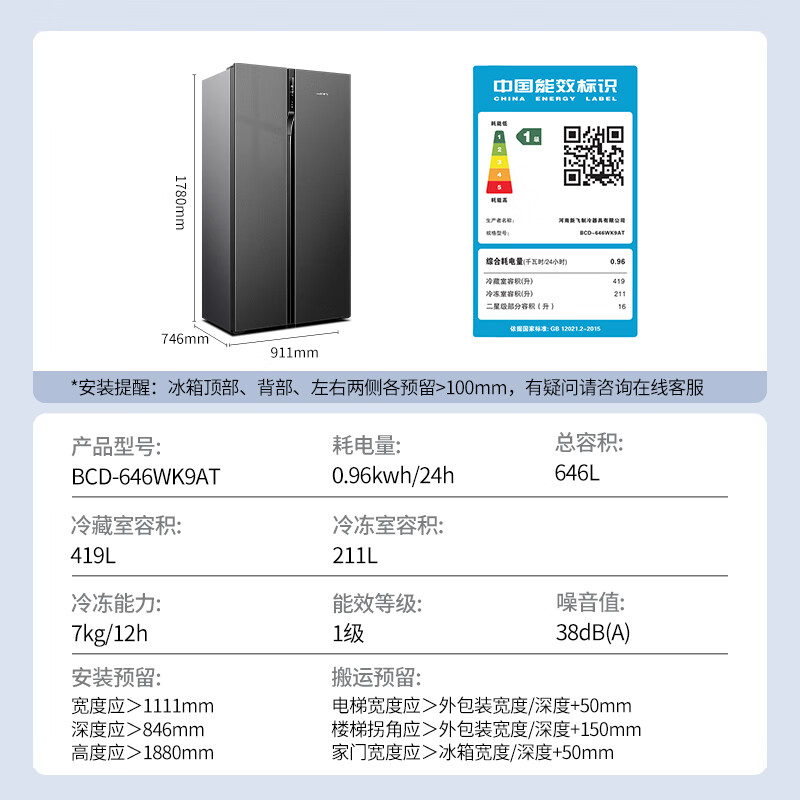 新飞(Frestec)646升双开对开门风冷无霜一级变频家用电冰箱大容量净味电脑控温补贴BCD-646WK9AT价格:2399.00元!