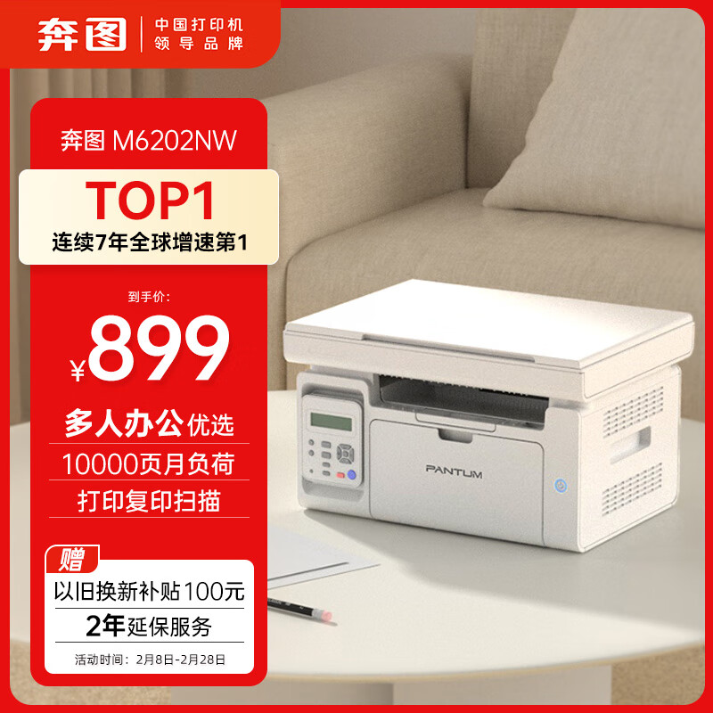 奔图(PANTUM)M6202NW激光打印机家用 复印扫描一体机 有线无线连接 办公资料学生作业打印价格:899.00元!