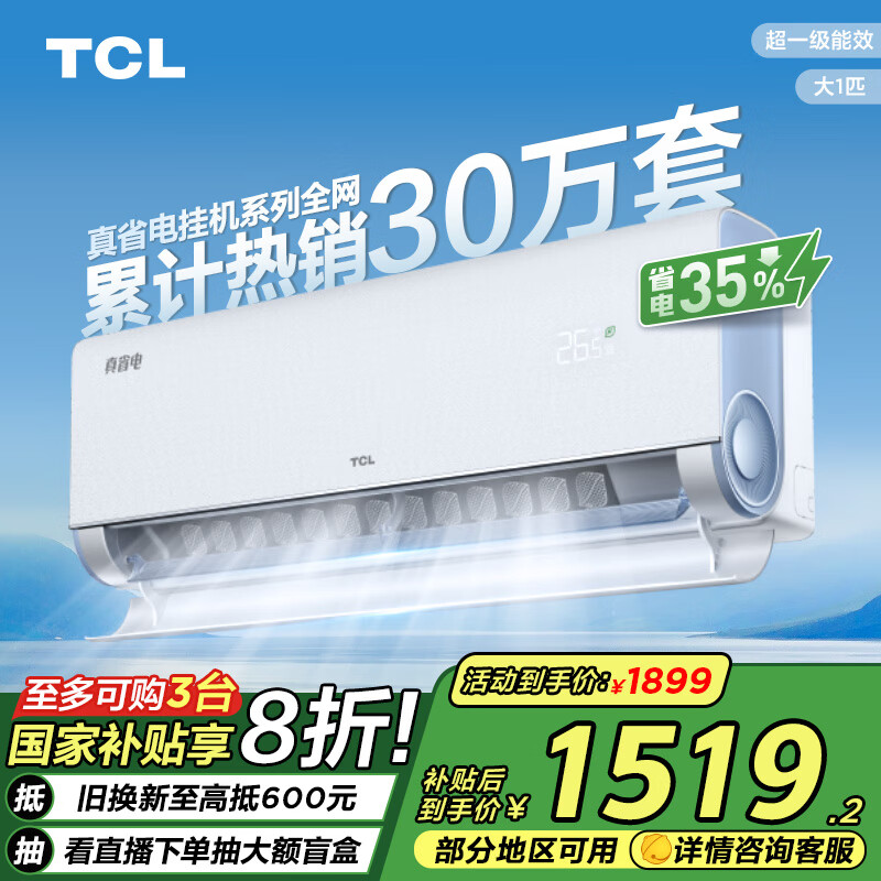 TCL空调 1匹小蓝翼真省电 空调挂机 超一级能效省电35%冷暖 KFR-26GW/RV2Ea+B1以旧换新补贴价格:1899.00元!