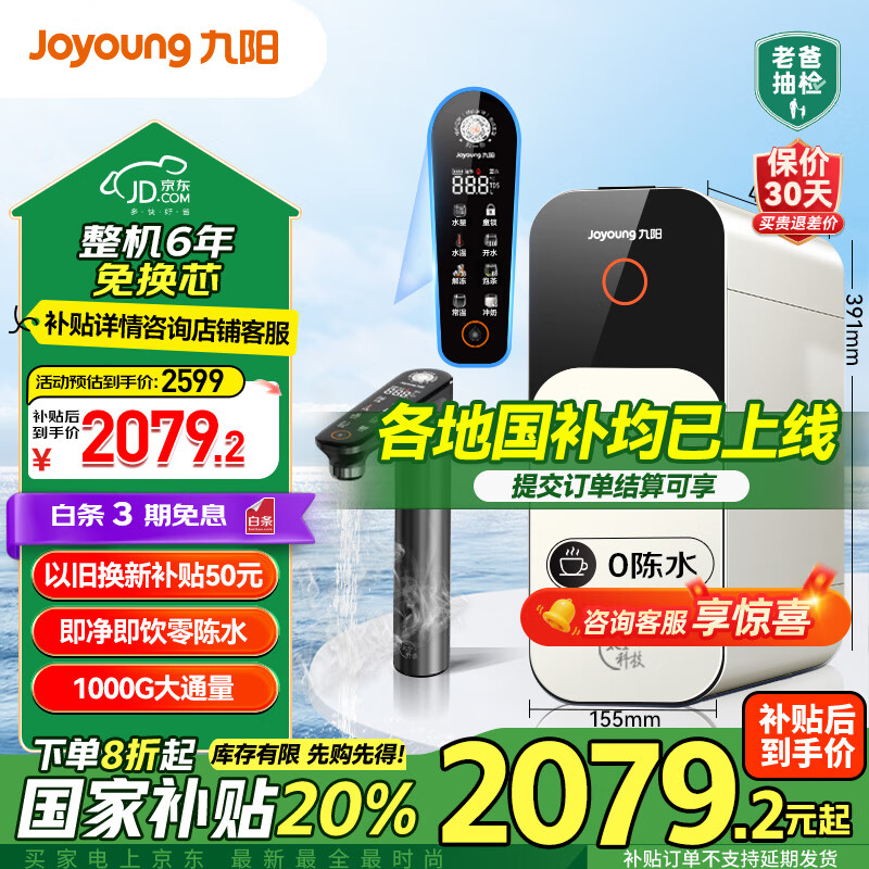 九阳(Joyoung)热小净R1 1000G加热净水器2.5L/min大流速即热净水机TDS数显厨下式家用RO反渗透一体净饮机 RF601价格:2599.00元!