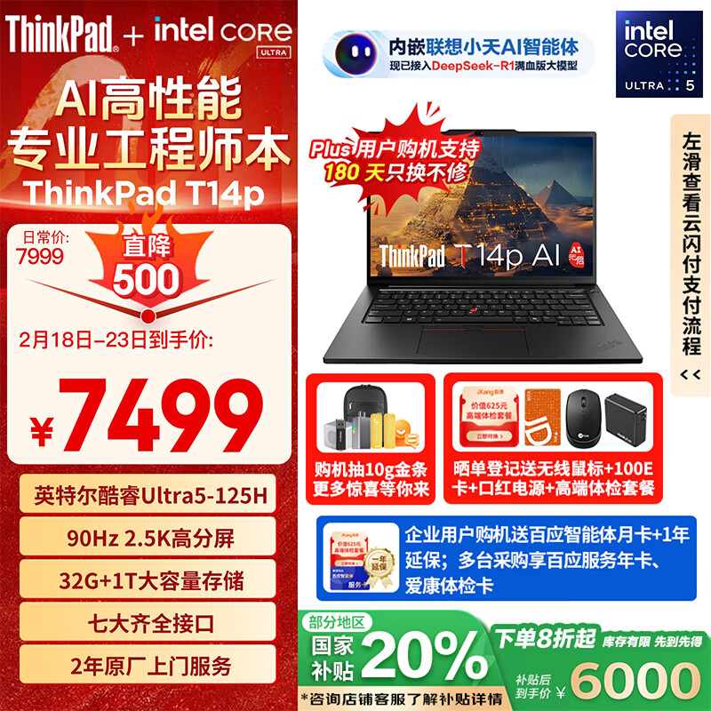 ThinkPad【补贴20%】T14p AI PC 酷睿Ultra5 高性能工程师本笔记本电脑 32G 1TB 2.5K 商务办公本价格:7499.00元!