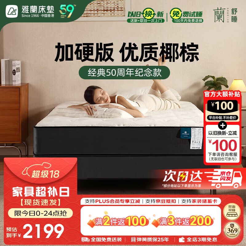 雅兰50周年纪念款 亲肤透气整网弹簧椰棕床垫 蘭朋友加硬版 1.8*2米价格:2599.00元!