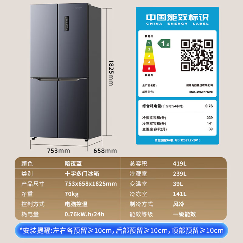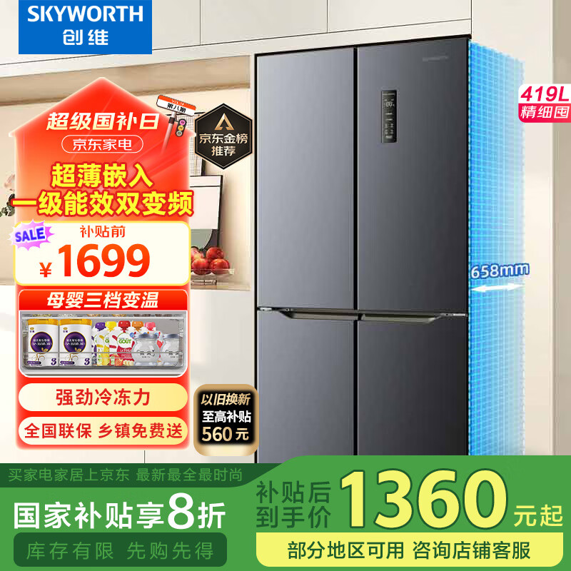 创维(SKYWORTH)419升风冷十字对开门四开门家用电冰箱一级能效变频超薄嵌入家电补贴BCD-419WXPS(N)价格:1699.00元!
