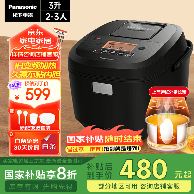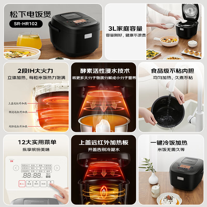 松下(Panasonic)电饭煲家用2-3人多功能IH电饭锅远红外加热煮饭锅智能预约不粘一级能效3升容量SR-HR102价格:599.00元!