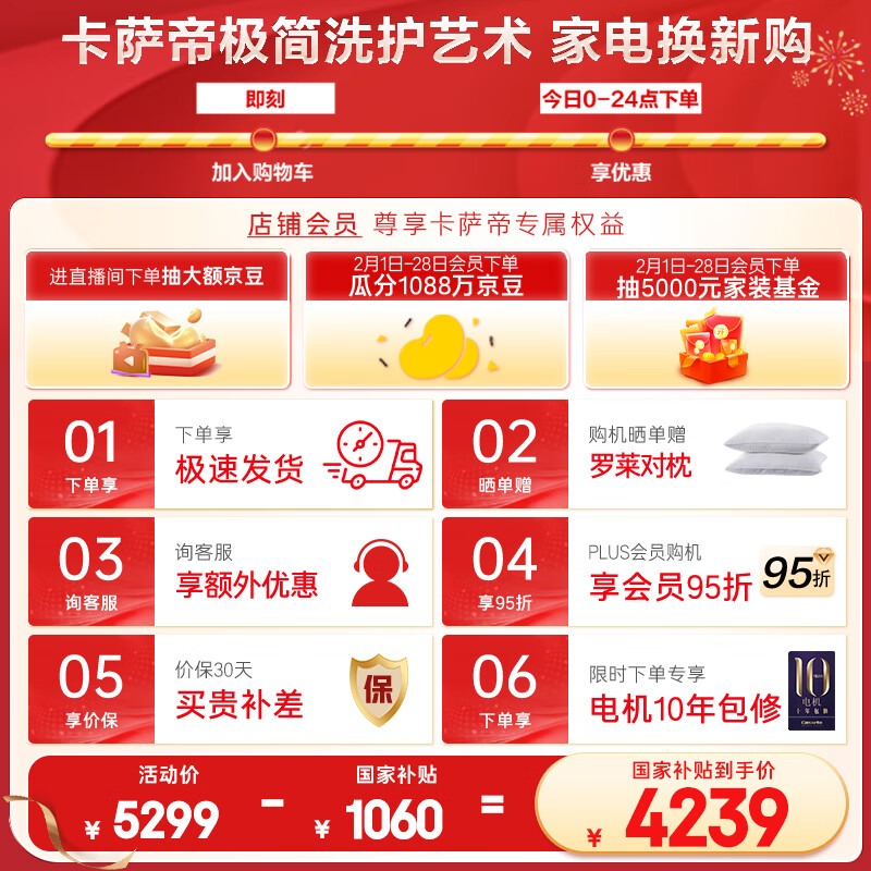 卡萨帝(Casarte)揽光W2滚筒洗衣机全自动家用 10公斤直驱变频 1.1洗净比 巴氏除菌 10W2ELU1 补贴20%价格:5299.00元!