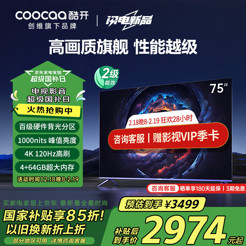 酷开创维Max75 75英寸电视 百级分区 1000nits峰值亮度 4+64GB 120Hz高刷护眼声控游戏智能电视机75P5E价格:3499.00元!