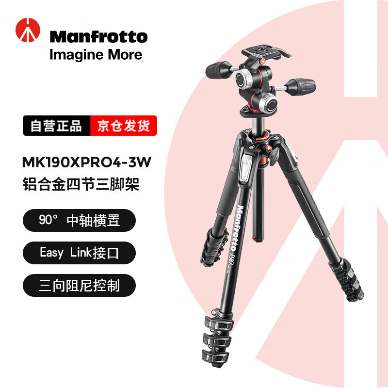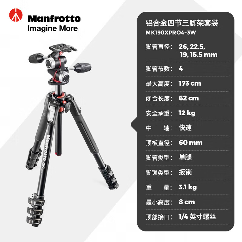 曼富图(Manfrotto)MK190XPRO4-3W 190系列铝合金四节三脚架三维云台套装中轴可横置稳定微单单反 承重12kg价格:2660.00元!