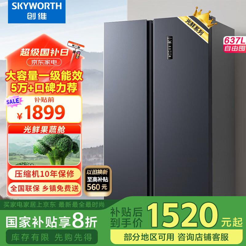 创维637升双变频一级能效风冷无霜超薄嵌入大容量对开双开门电冰箱家用家电补贴20%BCD-637WKPSN价格:1899.00元!