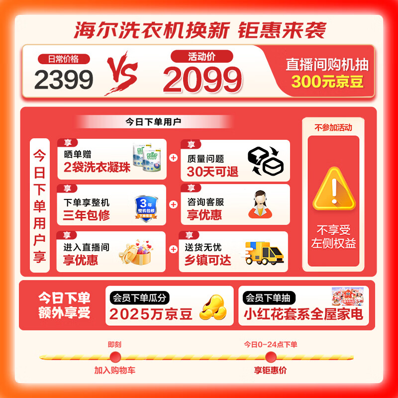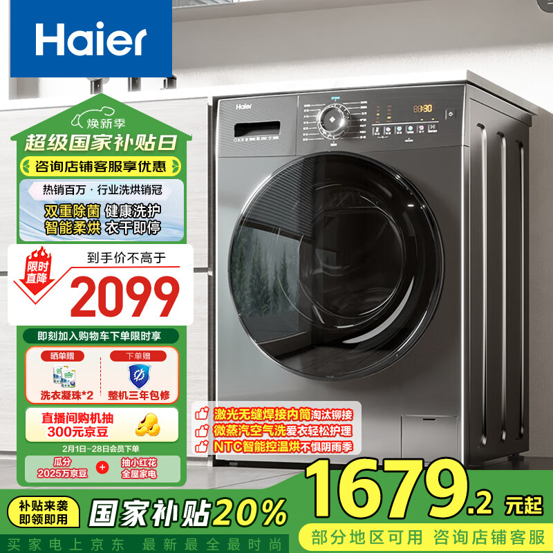 海尔(Haier)滚筒洗衣机全自动 洗烘一体机带烘干 超薄家用 10公斤大容量 EG100HMATE28S 以旧换新 一级能效价格:2099.00元!