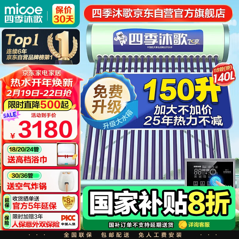 四季沐歌(MICOE)飞享国补太阳能热水器家用 防冻光电两用自动上水 电加热 一级能效 以旧换新18管140L送货+安装价格:3680.00元!